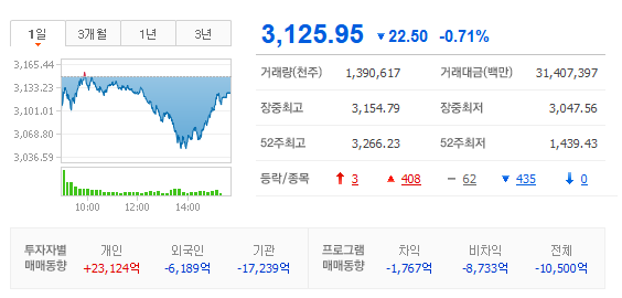 현재 동학개미는 기관과 외국인에 맞서 엄청난 매수세로 코스피 지수를 방어하고 있는 상황이지만, 기관의 매도세가 엄청나기 때문에 현재 코스피지수는 2일 연속 하락 마감 했습니다. 금일 장 막판에 다시 낙폭을 줄였다는게 그나마 희망적으로 볼 수 있겠죠. 동학개미는 오늘 2.3조를 순매수 했습니다. 어제가 역대급이었지만 오늘도 대단했죠.