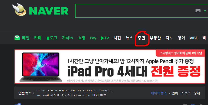 네이버 메인화면에서 증권으로 들어가 줍니다. 스마트폰으로는 네이버 PC 버전으로 들어가야 합니다.