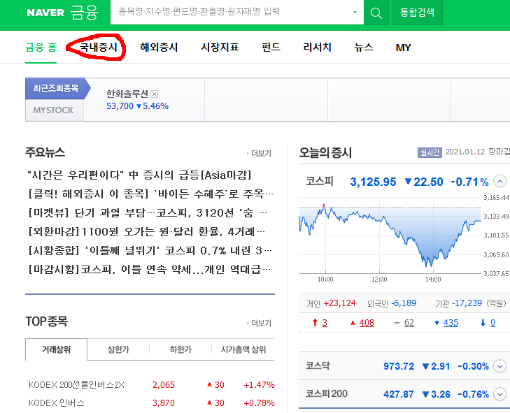 그리고 메인화면에서 국내증시를 들어가줍니다. 스마트폰에서도 국내증시 탭을 눌러주면 됩니다.