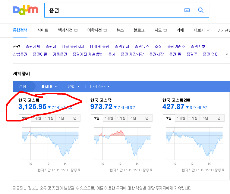 다음에서 증권을 검색 한 후에 코스피를 눌러줍니다. 코스닥이나 코스피200을 눌러도 상관 없습니다.