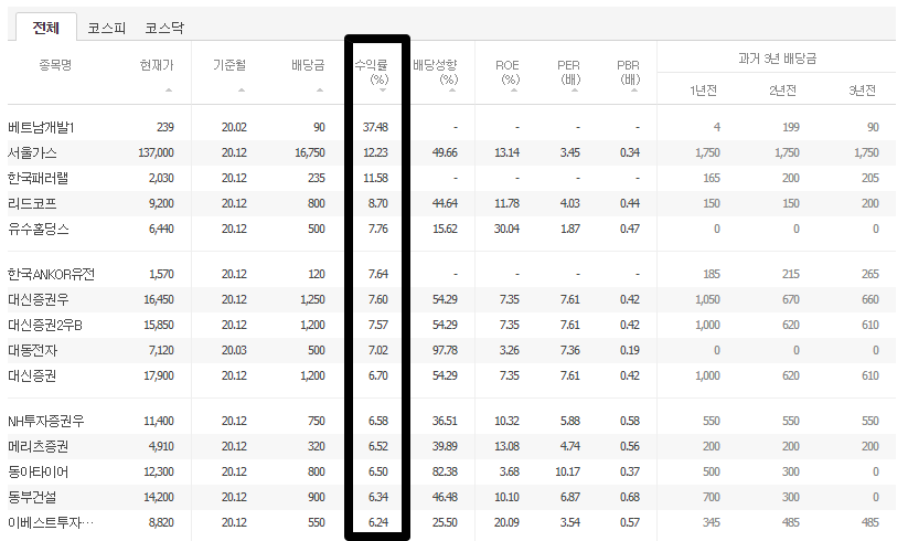 자 일단 베트남개발1이나 리츠는 뺐습니다. 진짜 배당만 받기 위한 위험한 종목 말고 어느정도 안정성 있는 종목들만 가져왔습니다. 역시 서울가스가 배당이 쎄군요.. 그 외에는 대부분 증권회사가 순위권에 들어와 있습니다.