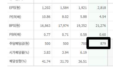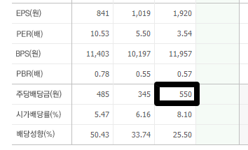 작년에는 1주당 550원의 배당을 주었는데, 아마 이번년도에는 배당을 더 늘릴거라고 봅니다. 실적이 워낙 좋게 나올 전망이라 그만큼 주주들한테 더 돌려주겠죠. 적당히 1주당 600원 정도로 배당금을 잡아보겠습니다.