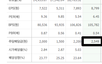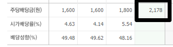배당금도 이번에 화끈하게 올렸습니다. 계속 천원대였던 배당금을 이번에 2,178원으로 올렸네요.