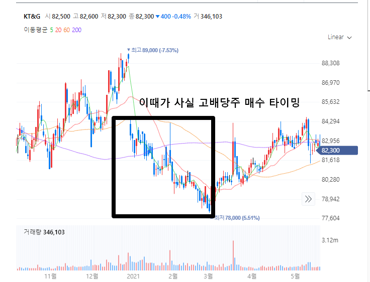 저는 배당주 종목들을 매수하기 가장 좋은 타이밍은 사실 1월초부터 2월 사이라고 봅니다. 대표적으로 KT&G 같은 경우 12월 말에 배당을 받기 위한 사람들의 매수로 인해 가격이 펌핑되고, 그 후 급격히 가격이 하락합니다.