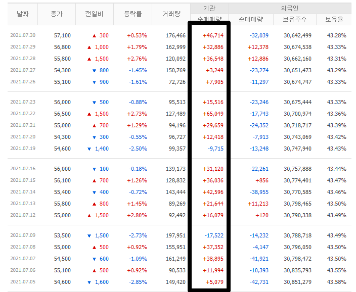 거기에 7월 초부터 기관이 계속해서 사들이고 있습니다. 상당히 많은 물량을 쓸어담고 있는 중인데.. 흠 이게 조금 수상해보였습니다.