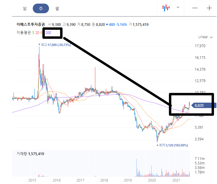 또한 제가 종목이 저평가 되어있는지 볼때 가장 유심히 보는 주봉 200일선! NH 투자증권은 주봉이 아직도 200일선에서 머무르고 있습니다. 합격입니다.