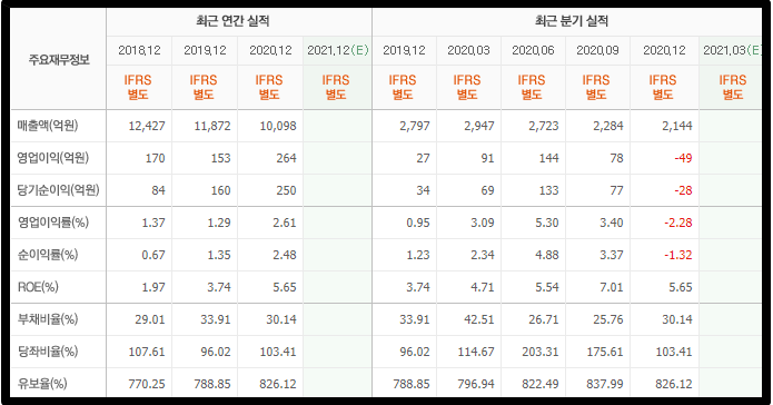 남해화학의 재무정보입니다. 2020년도 4분기를 제외 하면 실적은 꾸준히 흑자가 나오고 있습니다. 꽤 탄탄한 실적을 보여주고 있죠. 연간으로 따져보면 2020년도는 4분기가 적자임에도 불구하고 2019년 대비 순이익이 90억원이 증가했습니다.
