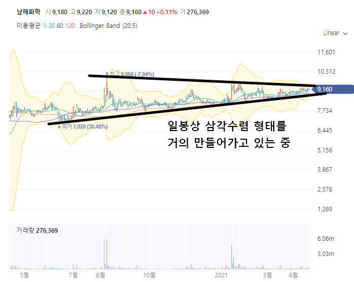 거기에 일봉을 보면 천천히 옆으로 횡보하는 듯 보이지만 저점은 계속 높아지고 고점은 9천원대를 유지해 주면서 삼각수렴을 해나가고 있습니다. 삼각수렴의 끝지점에서는 항상 시세의 분출.. 요거는 뭐 주식차트의 기본이죠.