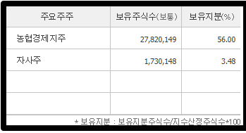 주요주주 보유지분도 괜찮습니다. 농협경제지주가 56%를 가지고 있습니다.