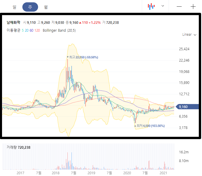 사실 남해화학의 차트는 크게 분석할 필요가 없을 정도로 바닥권이라고 보시면 됩니다. 코로나 하락 최저점 대비 2배 이상 올라오지 못한 종목은 적어도 비싸게 주고 사는건 아닙니다.