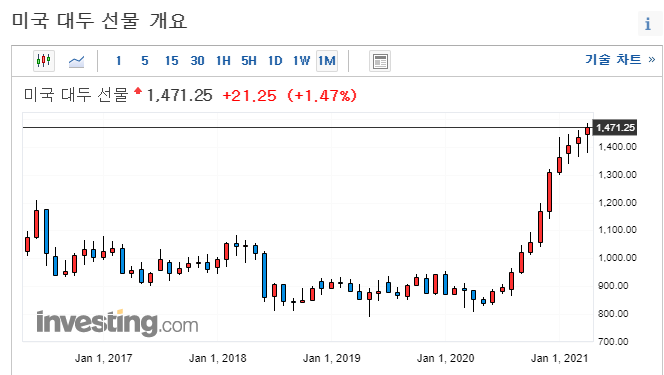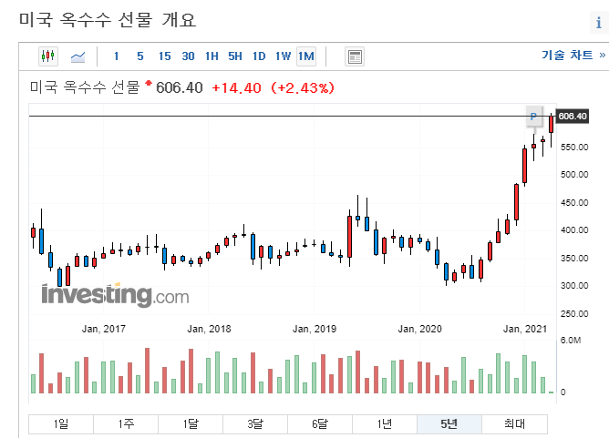 지금 원자재 재료들의 가격이 심상치 않게 상승하고 있습니다. 특히 옥수수와 대두 선물 같은 경우는 1년 그래프를 보면 미친듯이 폭등하고 있습니다.