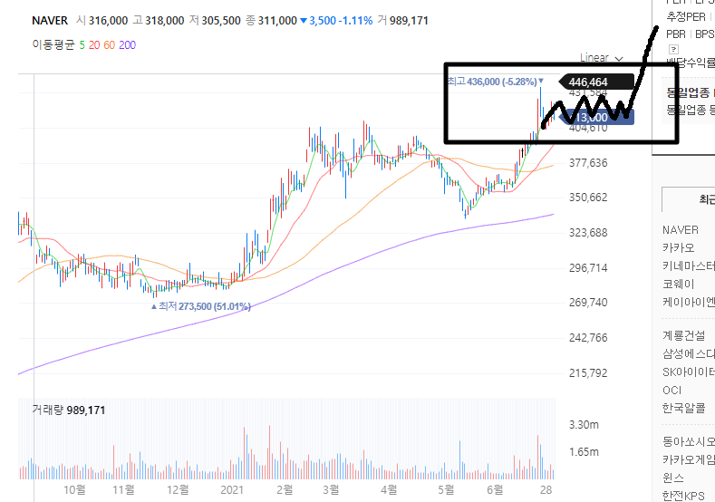다만 현재 네이버의 경우 뒤늦게 카카오를 따라서 급상승했다가 빠지고 있는 추세이기 때문에 섣불리 매수를 하지는 말고 몇일간의 움직임을 더 보고 매수하세요.