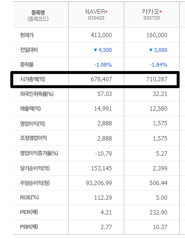 최근에 시가총액을 카카오에게 따라잡히면서 상당히 굴욕을 맛보고 있는 네이버인데요. PER이나 PBR 면에 있어서도 네이버는 카카오보다 꽤 저평가 되어있는 상황입니다.