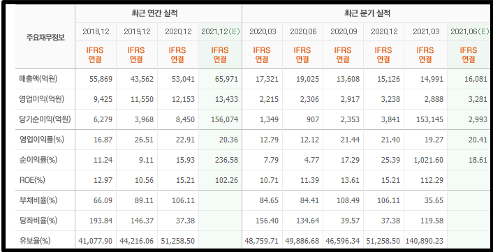 바로 실적부터 보시면 아주 탄탄한게 눈에 보이시죠. 사실 뭐 재무 부문에 있어서 말할 필요가 없이 탄탄하고 영업이익이나 매출 역시 걱정할 필요가 없는 초우량 기업입니다.