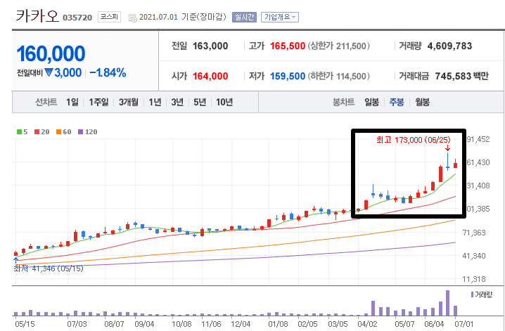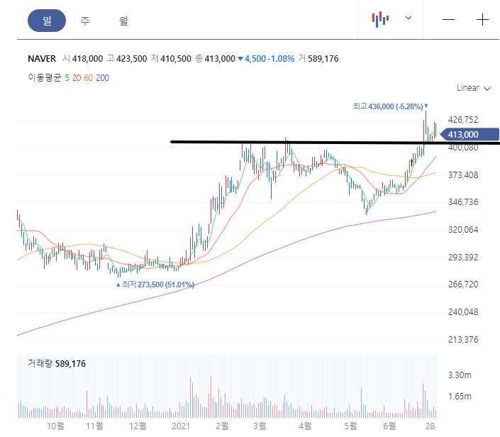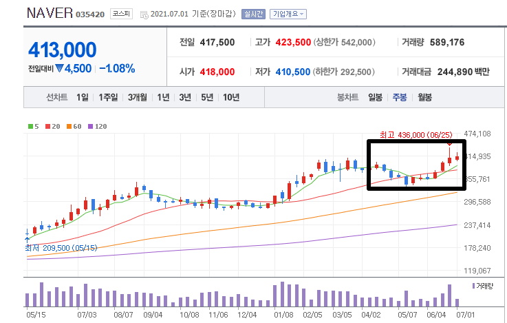 다만 현재 네이버의 경우 뒤늦게 카카오를 따라서 급상승했다가 빠지고 있는 추세이기 때문에 섣불리 매수를 하지는 말고 몇일간의 움직임을 더 보고 매수하세요.