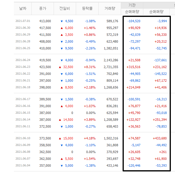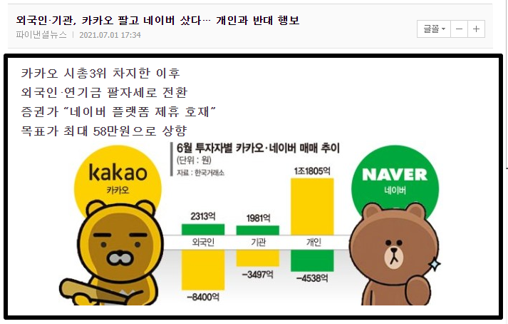 저도 진작에 카카오가 엄청 폭등하는데 네이버는 안가길래 미리 매수했었습니다. 기관, 외국인 투자자랑 비슷하게 움직였는데 확실히 수익이 바로 나더라구요.