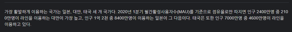카톡은 아마 우리나라 사람 다 합쳐도 5천만 정도라고 하면 라인은 일본,대만,태국 합쳐서 최소 2억명 정도 됩니다. 다만 이걸 가지고 비교하기는 애매하지만요. 그만큼 네이버가 라인으로 창출할 수 있는 수익이 어마어마하다는 겁니다.