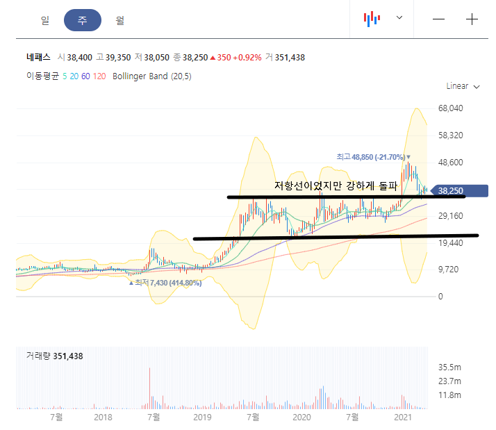 지금 주봉 차트를 보시면 네패스는 2021년까지 박스권에 갇혀있던 종목이었지만 2021년에 저항선을 강하게 돌파해버렸습니다. 이렇게 되면 이전 저항선이 다시 저항선으로 바뀌면서 하락을 하더라도 그 곳을 지켜주게 되죠.