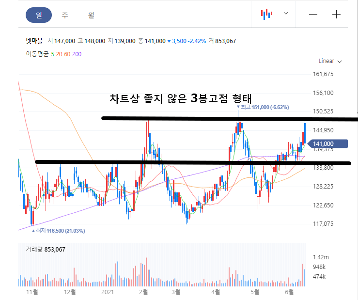 보통 신작게임의 기대감으로 인해 오른 게임주가 한번 빠지기 시작하면 꽤 무섭게 빠지기 때문에 중요선들을 지지해주는지 잘 살펴보고 만약 추가로 계속 하락을 한다면 손절은 필수로 하셔야 한다고 봅니다.