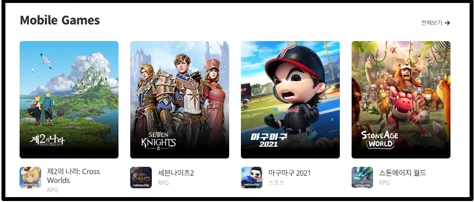 특히 넷마블은 이제 모바일게임을 주력으로 영위하고 있는 중입니다. 아마 가장 유명한 '모두의 마블' 을 필두로 '스톤에이지', '세븐나이츠' , '몬스터길들이기' 등 다양한 장르의 모바일게임을 개발 및 퍼블리싱 하고 있습니다.