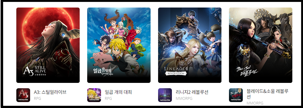 넷마블은 사실 우리나라의 대표적인 게임회사입니다. 대표적인 한국의 3개 게임 회사, 3N ( Nexon, NC soft, Netmable ) 의 한축을 담당하고 있으며 마구마구 부터 그랜드체이스까지 매우 다양한 게임을 만든 회사죠.