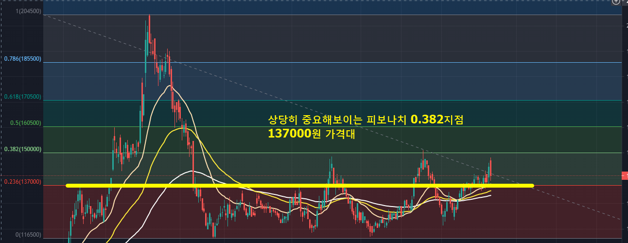 애초에 그전에 137,000원 가격대도 매우 중요하게 봐야하는 구간입니다. 지지를 해준다면 다시 한번 좋은 상승을 노려볼 수 있겠지만, 저길 깨고 134,000원대도 깨고 내려간다면 사실상 꽤 큰 하락을 각오 해야한다고 보여집니다.