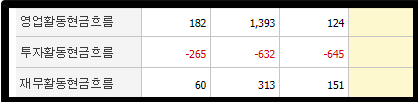 현금흐름 역시 약간 아쉬운 부분이 있습니다. 투자활동은 꾸준히 계속 이어나가고 있다는 점이 그나마 괜찮습니다.