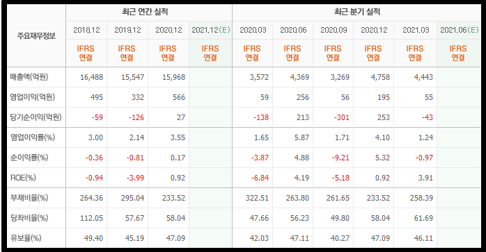 다만 실적은 약간 아쉬운 편입니다. 특히 2020년에는 어느정도 흑자로 겨우 돌아섰지만.. 2021년 2분기 영업이익이 다시 적자로 전환했습니다. 코로나바이러스가 장기화 됨에 따라 해외수주 프로젝트들이 순연되었기 때문이죠.