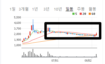 보통 이런 차트는 계속해서 하락하다가 반등이 한번씩 크게 나오는데요. 마침 8월 5일이 좋은 뉴스재료와 함께 상승을 보여줬다고 보면 될 것 같습니다.