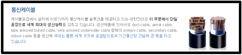 대한전선은 국내 최초의 종합전선 회사입니다. 1955년에 설립되었기 때문에 엄청난 전통과 역사를 자랑하는 전선회사입니다. 주요사업은 전선부문으로 초고압케이블, 통신케이블 등을 다루고 있습니다.