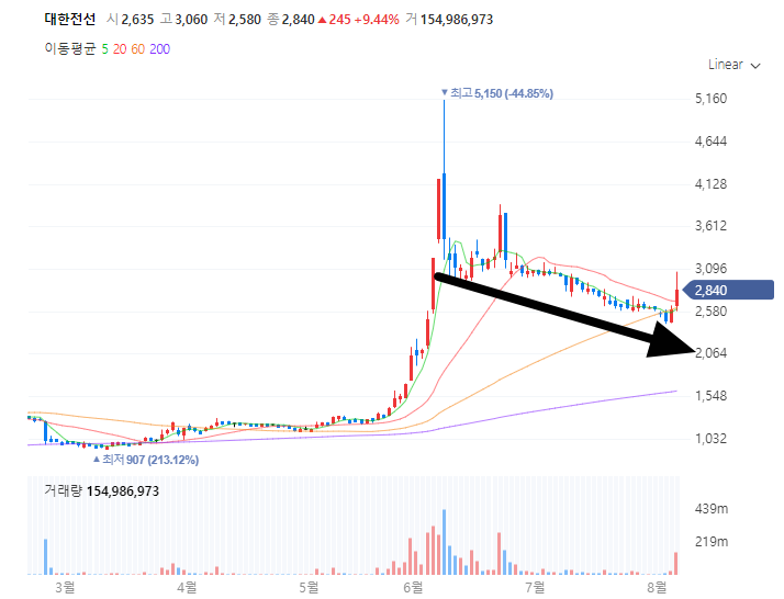 대한전선은 솔직히 기존 보유자분들의 영역이지, 신규매수를 할 타이밍은 아니라고 봅니다. 물론 정말 고수분들이나 내가 하이리스크 - 하이리턴을 좋아한다 하시면 들어가볼만 하지만