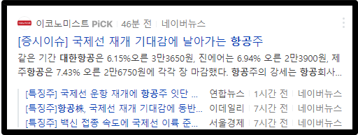 하지만 주가는 그렇지 않습니다. 무조건 기대감으로 인해 먼저 올라버리죠. 지금 보시면 항공주가 상당히 불을 뿜으면서 상승하고 있죠? 선반영이라는 겁니다. 실적이 좋아질거라는 기대감으로 인해 먼저 주가가 상승하는거죠