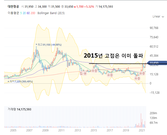 2015년 고점, 그리고 2021년 초에도 넘으려고 했지만 못넘었던 3만 2천원 중-후반대 가격을 가뿐이 넘고 이제는 3만 3천원대에 안착해있습니다. 이렇게 되면 다음목표는 그 전 고점인 4만원 초-중반대가 되는데요. 제 생각에는 여기까지는 가기 조금 힘들지 않을까 싶네요.