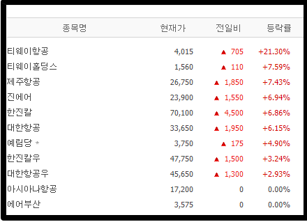 하지만 주가는 그렇지 않습니다. 무조건 기대감으로 인해 먼저 올라버리죠. 지금 보시면 항공주가 상당히 불을 뿜으면서 상승하고 있죠? 선반영이라는 겁니다. 실적이 좋아질거라는 기대감으로 인해 먼저 주가가 상승하는거죠