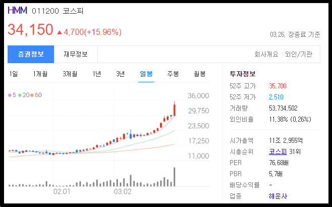 지금 이미 공급 부족을 겪고 있는 해운시장 상황에 이번 사고까지 딱 겹쳐버리면서 해운 운임료가 급등할 것으로 예측되서 모든 해운관련주가 떡상을 해버린거죠.. 원래 HMM은 계속 오르고 있었는데 이번 사건으로 인해서 오늘 미친 급등이 나온것입니다.