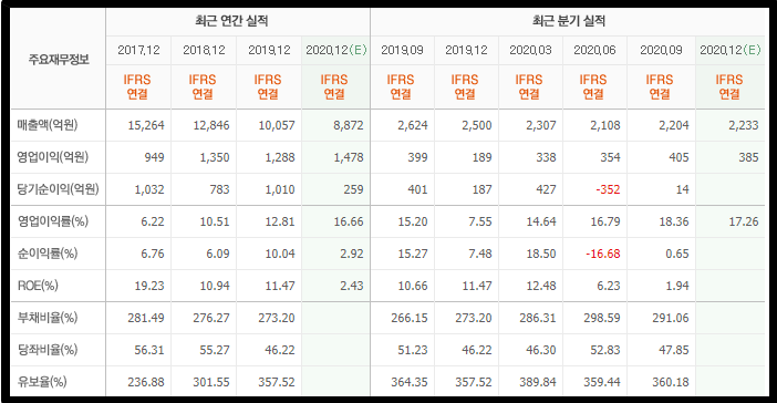 보시면 2020년 전까지는 매출이 1조 이상을 꾸준히 찍는 좋은 회사였습니다. ROE도 두자리 수 이상 꾸준히 나와주고 있었구요. 제가 항상 말하지만 ROE는 무조건 두자리 이상인 기업이 좋다고 했었죠.