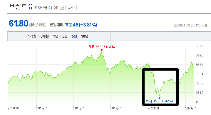 근데 2020년에 코로나 쇼크로 인해서 국제유가가 모두 곤두박질을 쳤었습니다. 심지어 마이너스까지 갔었을때도 있었구요. 그렇기 때문에 해운주는 엄청난 타격을 입을 수 밖에 없었죠. 게다가 원유를 주로 운송하는 대한해운은 뭐 당연히... 엄청난 피해를 입을 수 밖에 없었겠죠.