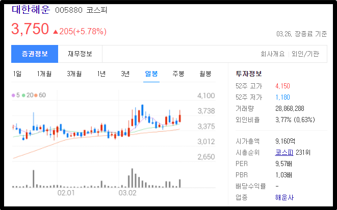 자 그래서 저는 너무 오른 HMM 말고 상대적으로 주목을 덜 받고 안오른 종목인 대한해운을 매수했는데요.
