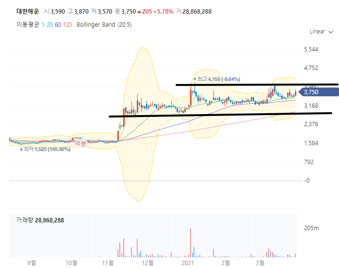 근데 저는 거래량에 어느정도 주목을 했습니다. 횡보를 길게 하는 동안 매도세는 거의 없고 어느정도 조금씩 매수세만 들어오는 거래량이 눈에 띄었습니다. HMM이 미친듯이 폭등할때도 가만히 있는 이녀석이 매력적이기도 했구요. 섹터 내 대장주 하나가 미친듯이 독주하다 보면 결국 같은 섹터 주식들도 따라 오르기 마련입니다.