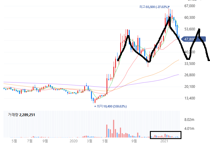 주봉상은 다만 하락하면서 거래량이 많이 없었기 때문에 추가적인 상승은 다시 충분히 나올 수 있습니다. 다만 매매할때 가장 중요한 점이 헤드앤숄더 형이 나오면 무조건 매도를 해야 합니다.