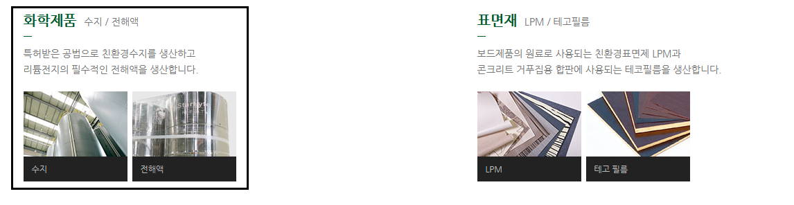 첫번째는 목재 산업으로 건장재,중밀도섬유판,파티클보드 를 취급하며 국내 강화마루 시장 점유율의 40%를 점유 하고 있는 마루 관련 국내 1위 기업입니다. 2차전지 산업 보다는 이쪽이 좀 더 메인 산업이기 때문에 목재 산업 투자를 더욱 공격적으로 하고 있는 추세이기도 하죠.
