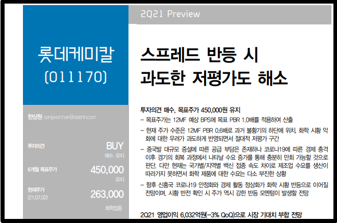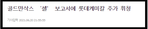바로 월가 골드만삭스에서 롯데케미칼 투자 의견을 '매도'로 내려버리고 적정 주가를 22만원으로 책정했기 때문입니다.