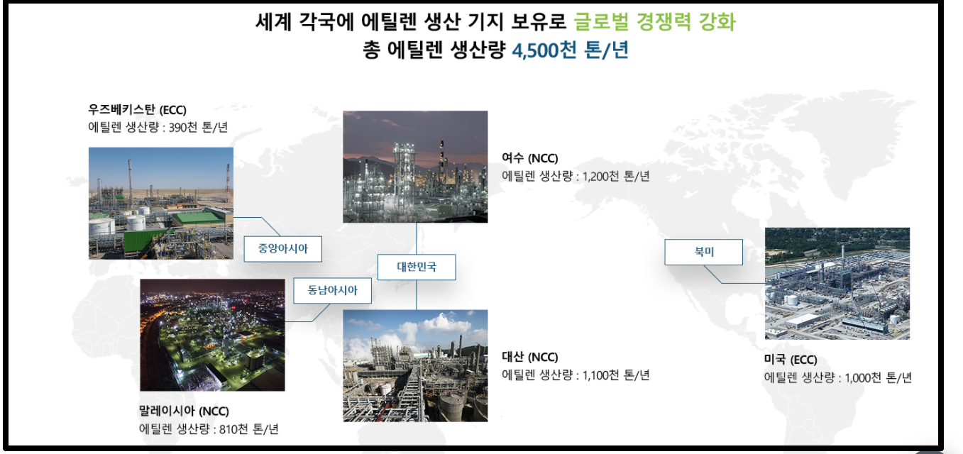 롯데케미칼의 주 생산원료인 에틸렌은 다양한 세계 각국 공장에서 생산되고 있습니다. 이미 우즈베키스탄과 여수, 미국과 말레이시아 등 꽤 다양한 지역에서 엄청난 양의 에틸렌은 생성중입니다.