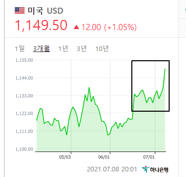 달러가 쌍바닥을 찍었기 때문에 언젠가는 상승이 나와줄거라고 봤지만 이렇게 빨리 급상승이 나올줄은 몰랐습니다. 특히 오늘 무려 1% 넘게 올라버렸네요.. 주식 비중이 100% 인 분들은 조심하시길 바랍니다