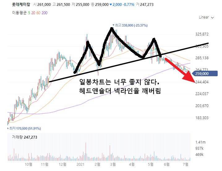 롯데케미칼의 일봉은 상당히 좋지 않습니다. 골드만삭스 매도 리포트 + 전체적인 화학주의 모멘텀 소멸로 인한 하락 + 차트기술적으로 헤드앤숄더 넥라인 깨짐 .. 모든 악재가 다 겹쳐서 현재 꽤 큰 하락조정이 나오고 있네요.