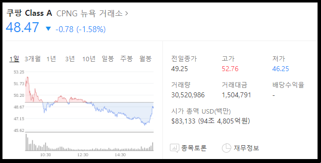 쿠팡이 드디어 상장을 했습니다. 초반에 60달러까지 치솟았다가 결국 차익실현 매물이 쏟아지면서 하락한 상황인데요.