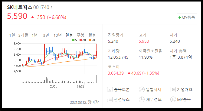 네번째 종목은 SK네트웍스 입니다. 최근에 배임 및 횡령 이슈가 터지면서 주주들의 불안함을 증폭시키는 듯 했지만 마켓컬리 관련 이슈로 상승을 보여줬습니다.