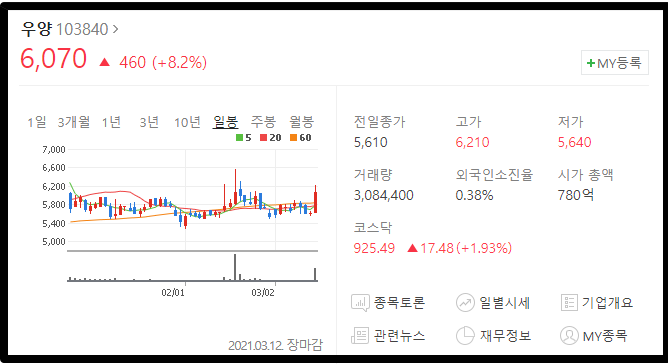 세번째는 우양입니다. 우양은 가정간편식/밀키트를 마켓컬리를 통해 공급하고 있기 때문에 올랐습니다 다만 위의 케이씨피드나 흥국에프엔비 처럼 힘이 강하진 않은 모습을 보여줍니다.