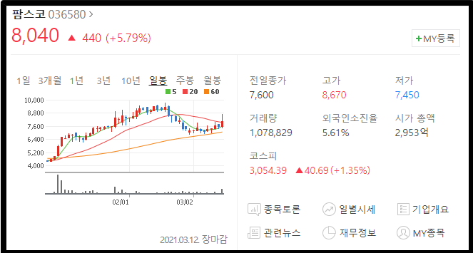 마지막 종목은 팜스코 입니다. 팜스코는 마켓컬리에 자체 브랜드 '하이포크'를 납품하기 때문에 관련주로 엮여서 상승했습니다.
