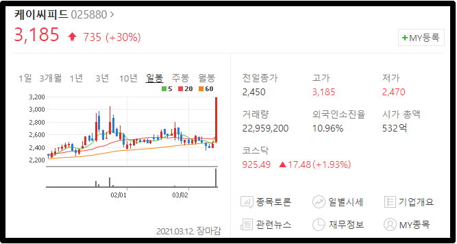 첫번째는 케이씨피드 입니다. 3월 12일에 상한가를 기록하면서 마켓컬리 관련주의 위력을 제대로 보여준 종목이죠. 케이씨피드는 마켓컬리에 유정란을 납품하는 기업으로 직접적인 관련이 있는 기업입니다. 그래서 힘이 매우 좋았구요.